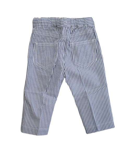 Pantalone in cotone, modello cinque tasche, fantasia a righe, vita elasticizzata.