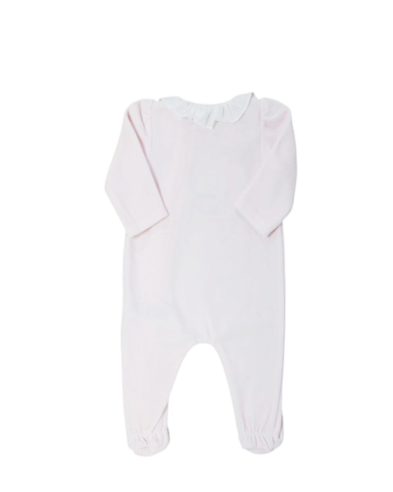 tutina per neonati. Realizzato in morbida ciniglia , con colletto a balze. Dettaglio rouches sul davanti. Chiusura ai lati con zip e bottoncini in madre perla