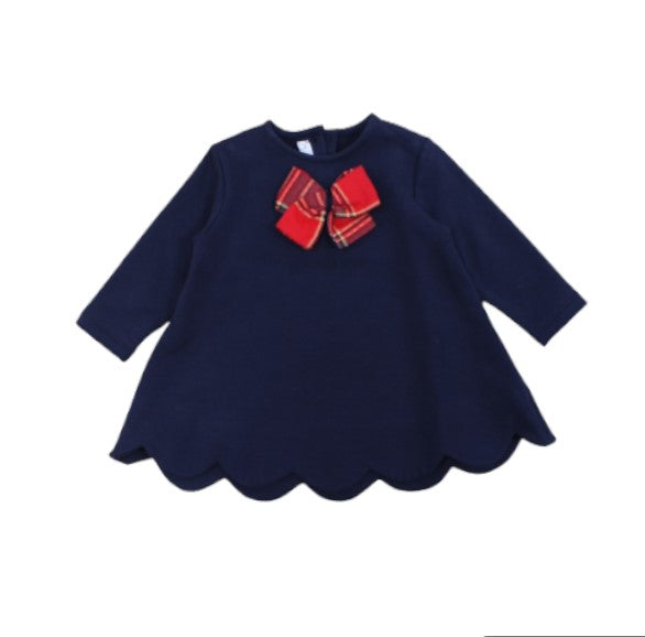 Vestina in tessuto punto Milano a manica lunga, colletto tondo, applicazione fiocco sul davanti, orlo smerlato, chiusura con bottoncini sul retro.