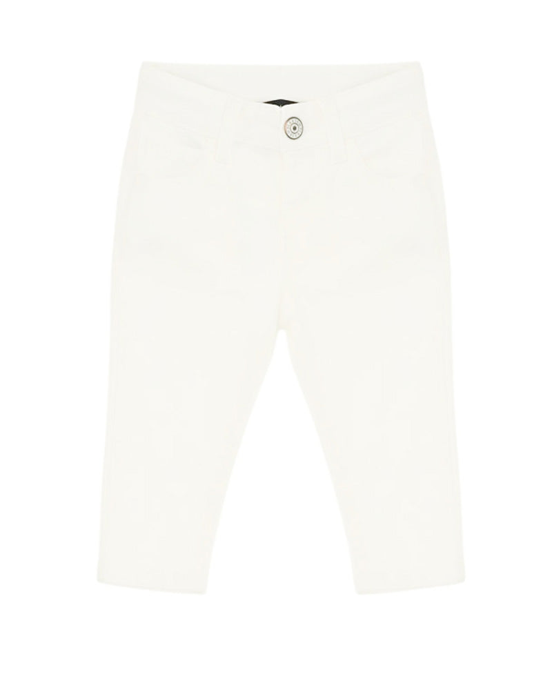 Pantaloni realizzati in morbido cotone, vita elasticizzata, bottone decorativo.