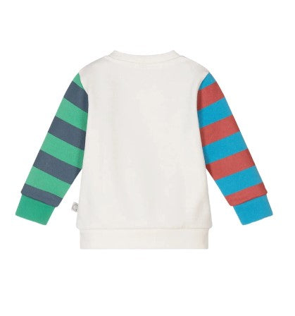 Felpa girocollo, collo polsi e orlo in costa, stampa sul davanti, applicazioni sul davanti, clips di chiusura sulla spalla.