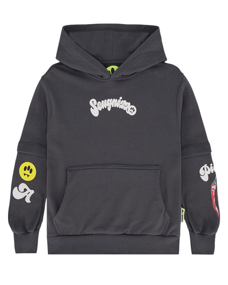 Felpa realizzata in cotone garzato, caratterizzata da cappuccio, maniche lunghe, tasca a marsupio sul davanti, fodera in pile, polsi e orlo a coste. È decorata con stampa logo sul cappuccio, stampa lettering sul petto, stampa Smile sulle maniche e stampa tre di bastoni sul retro.