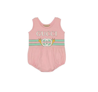 Pagliaccetto GUCCI rosa senza maniche con collo tondo, stampa forntale del logo e chiusura con bottoni a pressione.