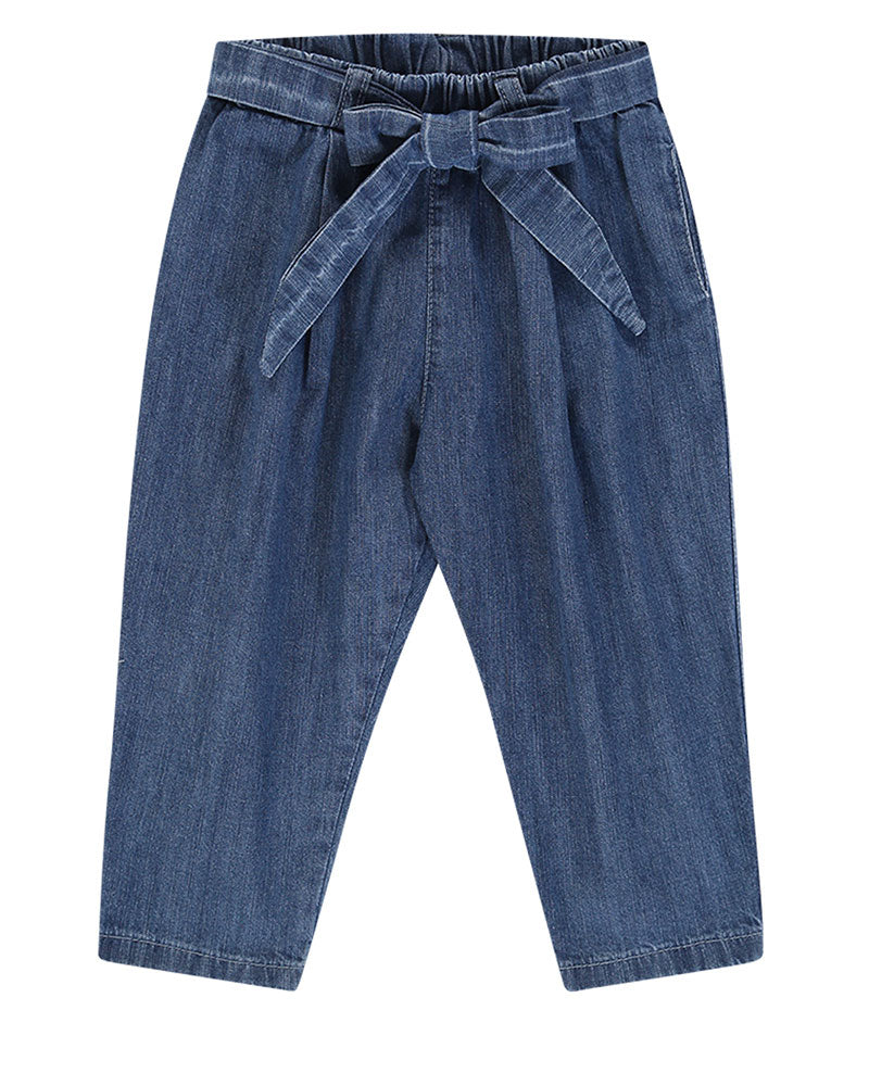 Pantaloni realizzati in leggero denim, vita elasticizzata, tasche a filo laterali, cintura in denim con fiocco.
