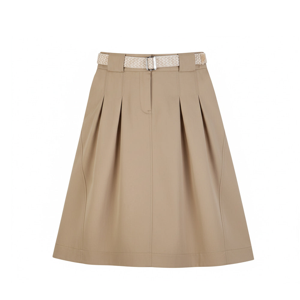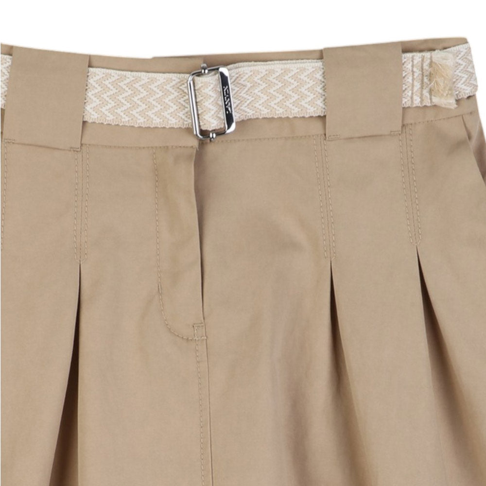 Gonna midi beige per bambina, realizzata in misto cotone. Il modello presenta chiusura frontale con gancio e zip, vita regolabile grazie ad elastico interno con bottoncini, due tasche laterali all'americana e due tasche con pattina applicate sul retro. È decorata con cintura con intrecciata in vita, logo ricamato sulla tasca posteriore e patch logo applicata.
