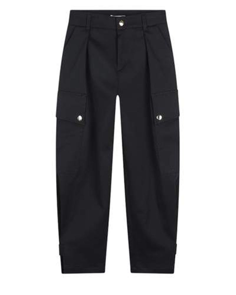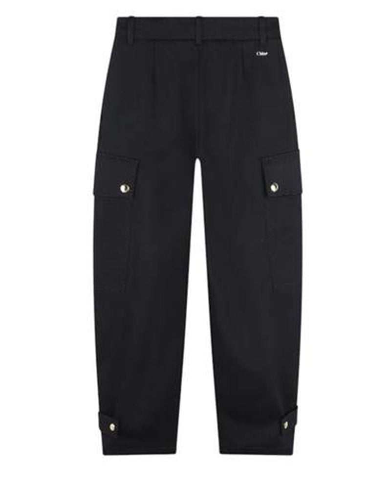 Pantaloni da bambina realizzati in twill di cotone, con dettagli plissettati. Presentano chiusura frontale con bottone a pressione e zip, vita regolabile grazie ad elastico interno con bottoni, tasche laterali america e tasche cargo sui lati. Sono decorati con logo applicato sul retro.