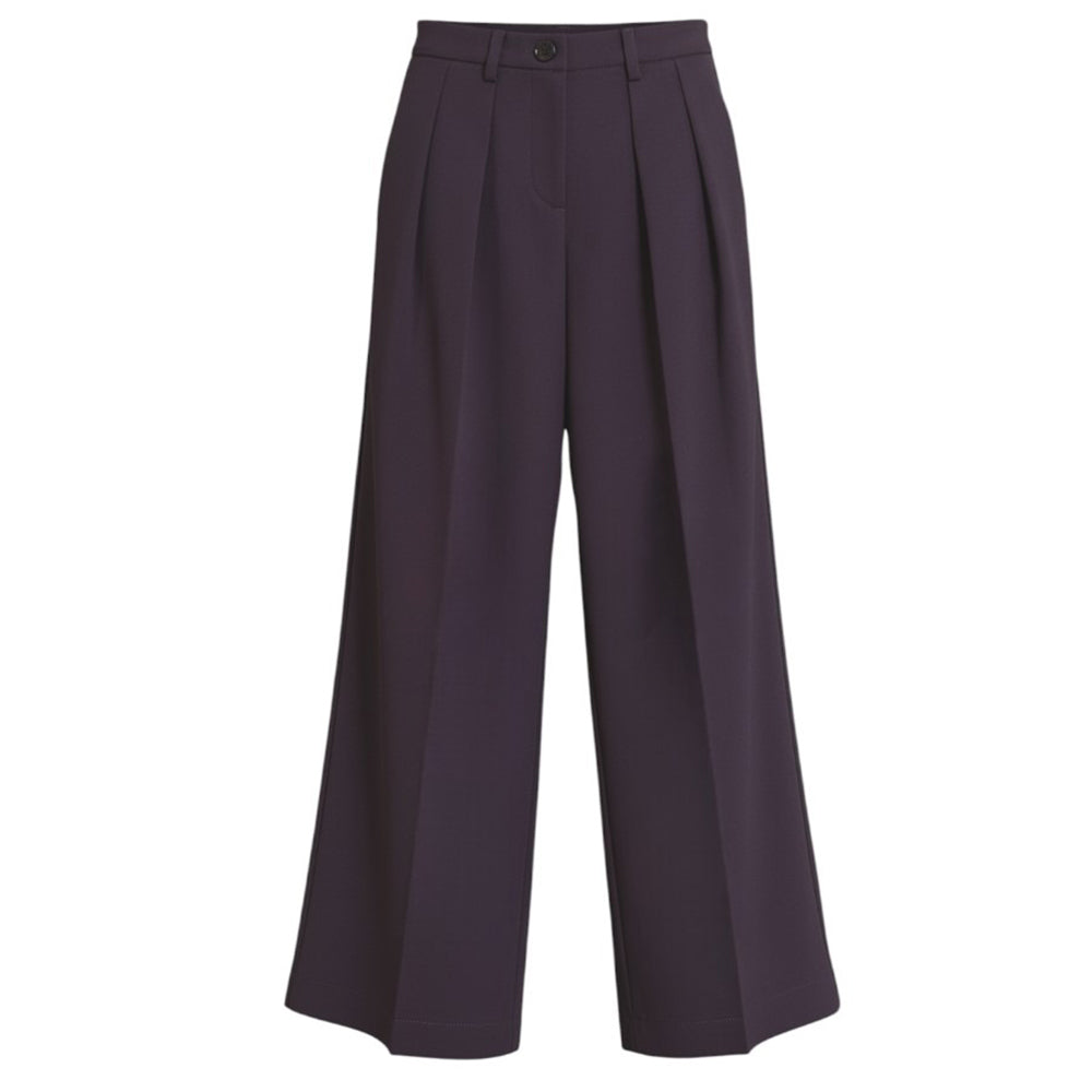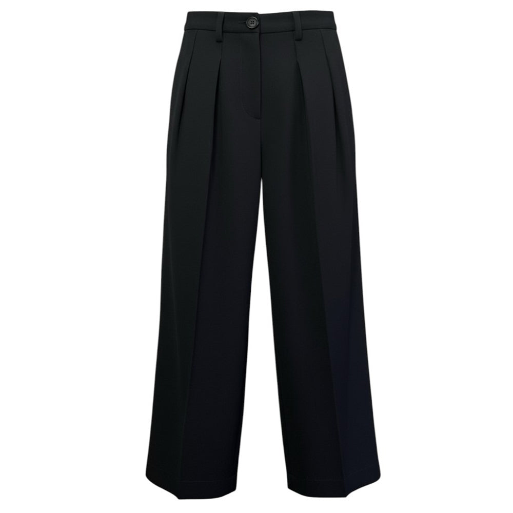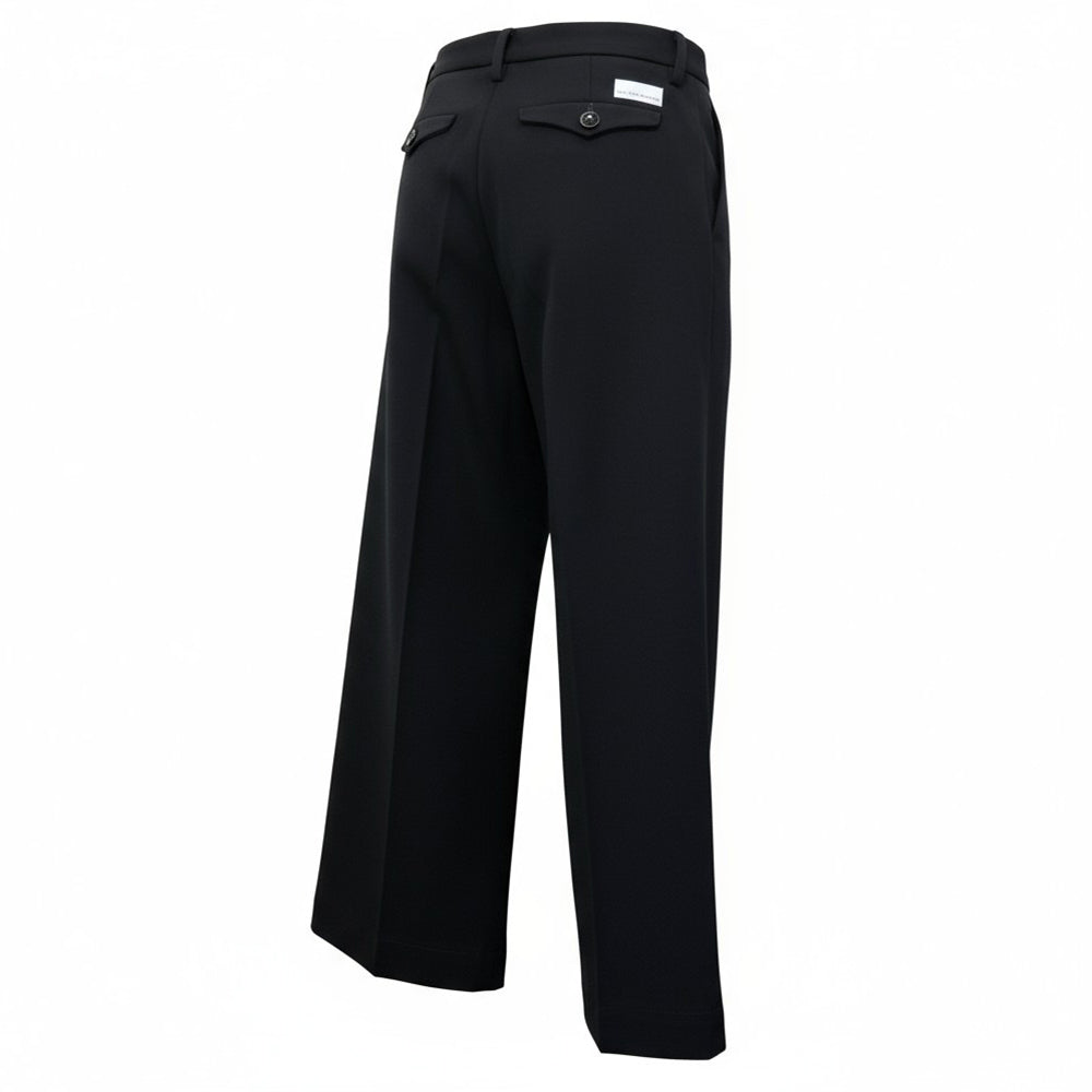 Pantaloni realizzati in fresco di lana, gamba dritta, chiusura frontale con bottoni e zip, vita regolabile grazie ad elastico interno con bottoni, passanti per la cintura, due tasche laterali a filetto e due tasche con patta sul retro. Sono decorati con patch logo applicata sulla parte posteriore.