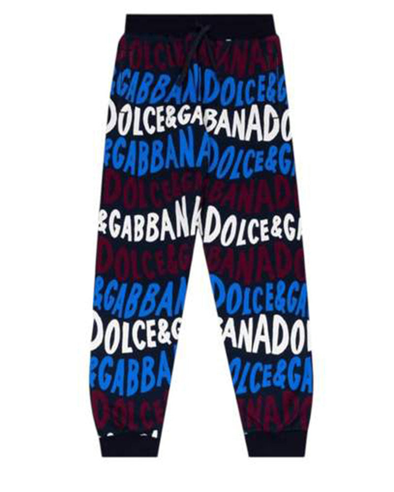 Pantaloni jogger da bambino realizzati in cotone. Presentano vita elasticizzata con coulisse, due tasche laterali a filetto, un taschino a filo sul retro e fondo con elastico alla caviglia. Sono decorati con stampa logo all-over