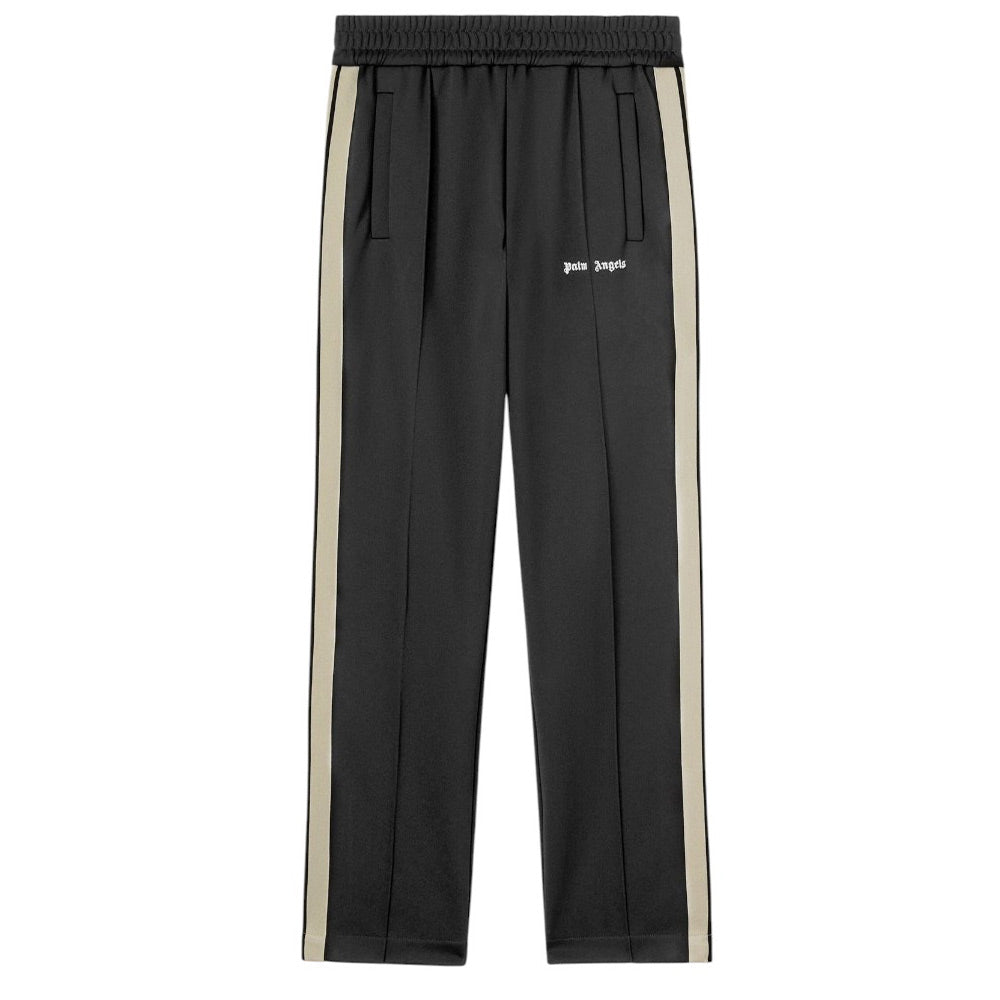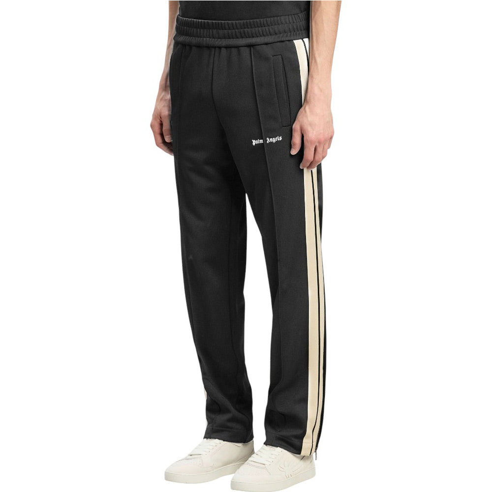 Pantaloni track in acetato di Palm Angels, caratterizzati da vita elasticizzata, due tasche laterali a filetto, gamba dritta e bande laterali in maglia écru. Sono decorati con logo ricamato sul davanti.