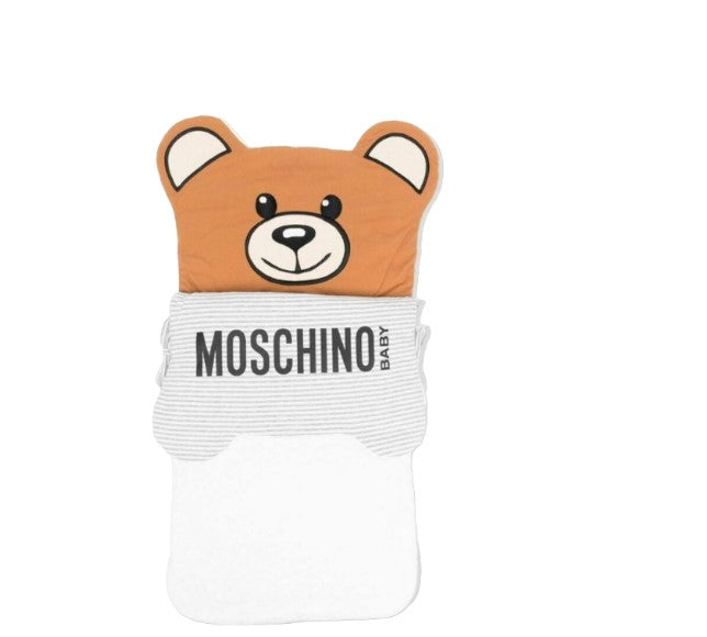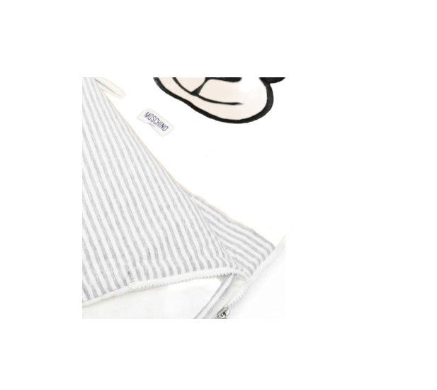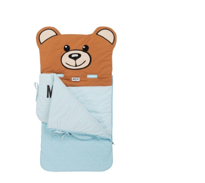 Sacco nanna Moschino imbottito celeste, a forma di orso, con risvolto a righe e chiusura con zip; è decorato con logo nero sulla parte anteriore e sagoma di Teddy bear ricamata all-over.