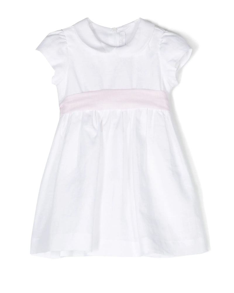 Vestina con colletto Peter Pan, maniche corte e chiusura posteriore con zip. Modello con cintura e dettaglio fiocco in vita, gonna svasata e orlo dritto. Foderato in cotone e completo di culotte coordinate.