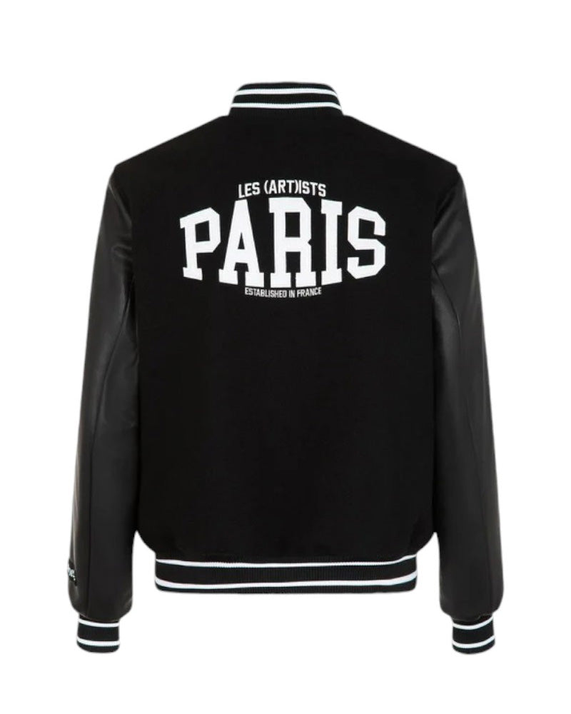 Giubbino in panno con maniche in pelle, chiusura con bottoni a pressione, rifiniture in costa, patch e logo applicati sul davanti, ricamo punto spugna sul retro.