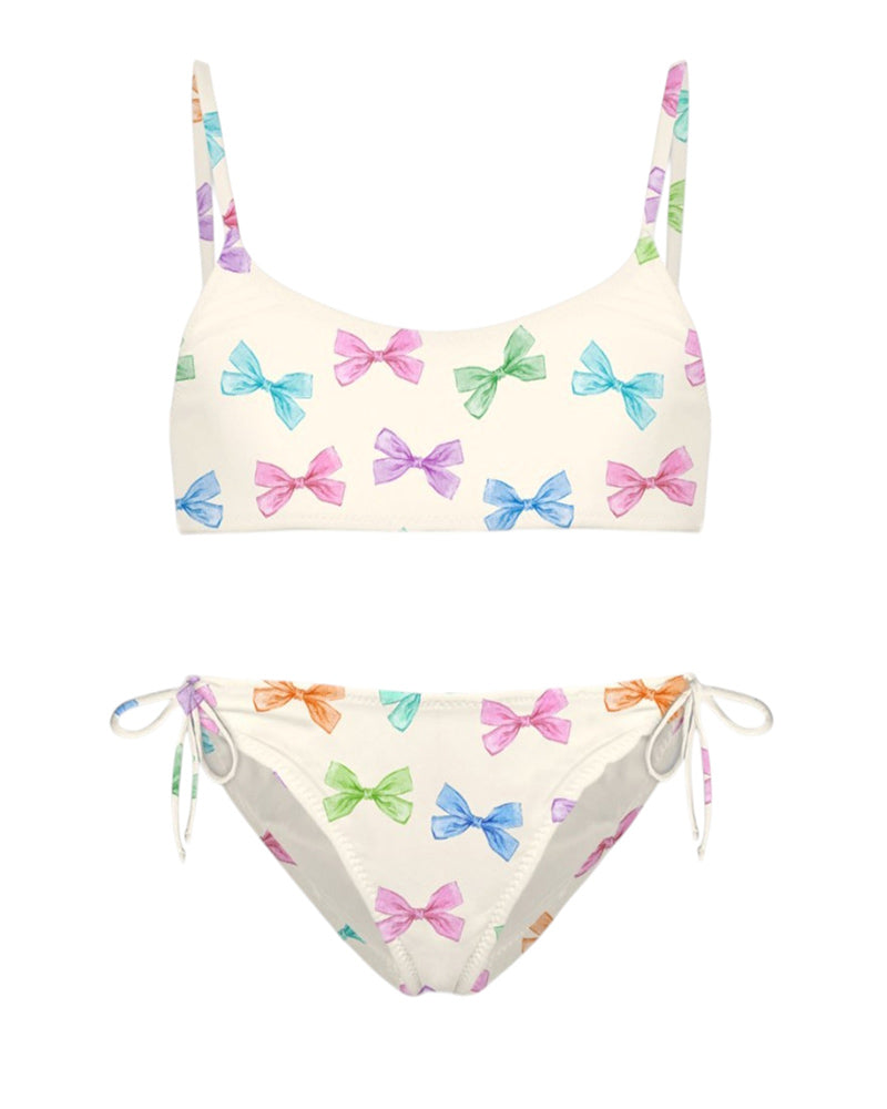 Costume Jaiden due pezzi realizzato in nylon da bambina. Presenta top a fascia con spalline regolabili; Slip con laccetti decorativi ai lati. È decorato con stampa Water Bows all-over e patch logata sul retro.