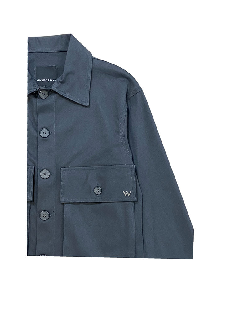 Giubbino in canvas tinto in capo, chisura frontale con bottoni, tasche applicate con patte e bottoni, logo applicato in metallo.