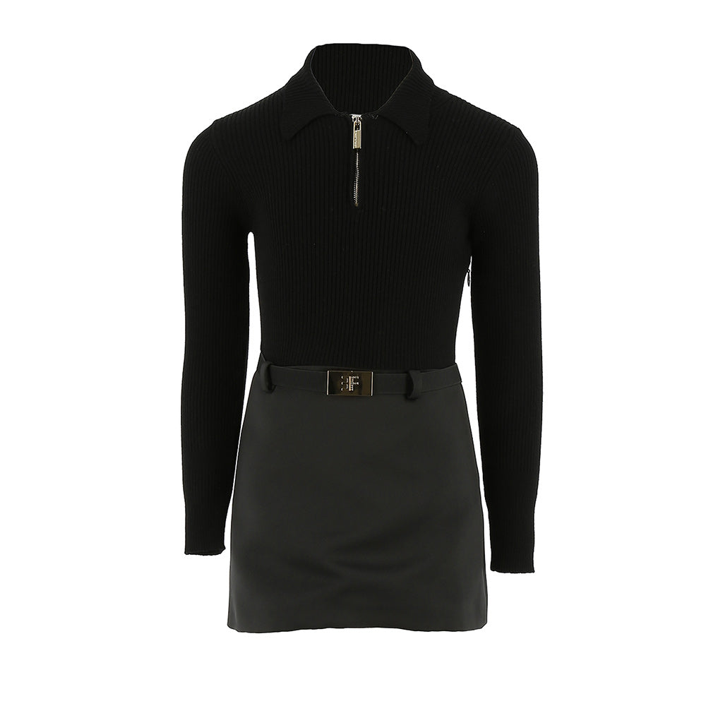 Abito tricot con trama a costine, collo alto, maniche lunghe, gonna in duchesse, cintura in vita, dettagli oro, chiusura nascosta laterale con zip. È decorato con ricamo logo a contrasto sul retro.