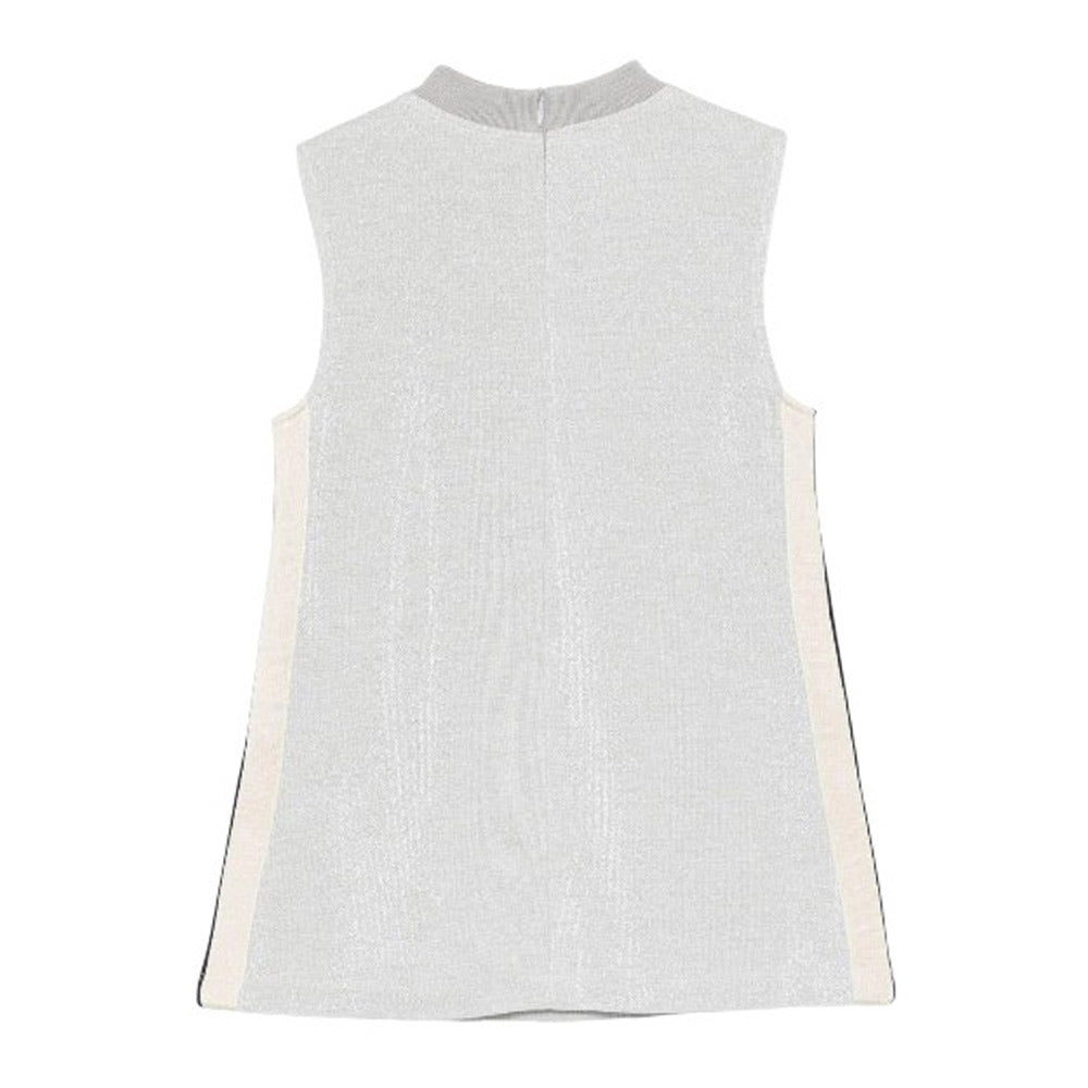 Abito realizzato in tessuto glitterato, caratterizzato da collo rotondi a costine, maniche a giro, due tasche applicate sul davanti, bande laterali in maglia ecru e chiusura con zip sul retro. È decorato con logo ricamato sul petto.