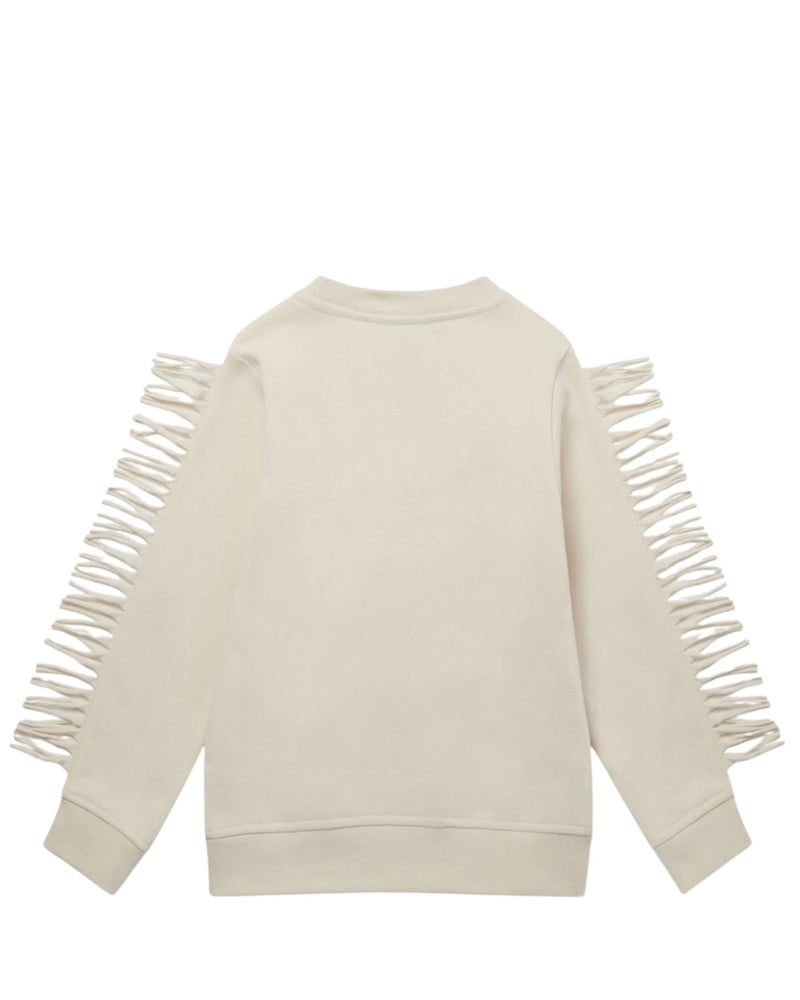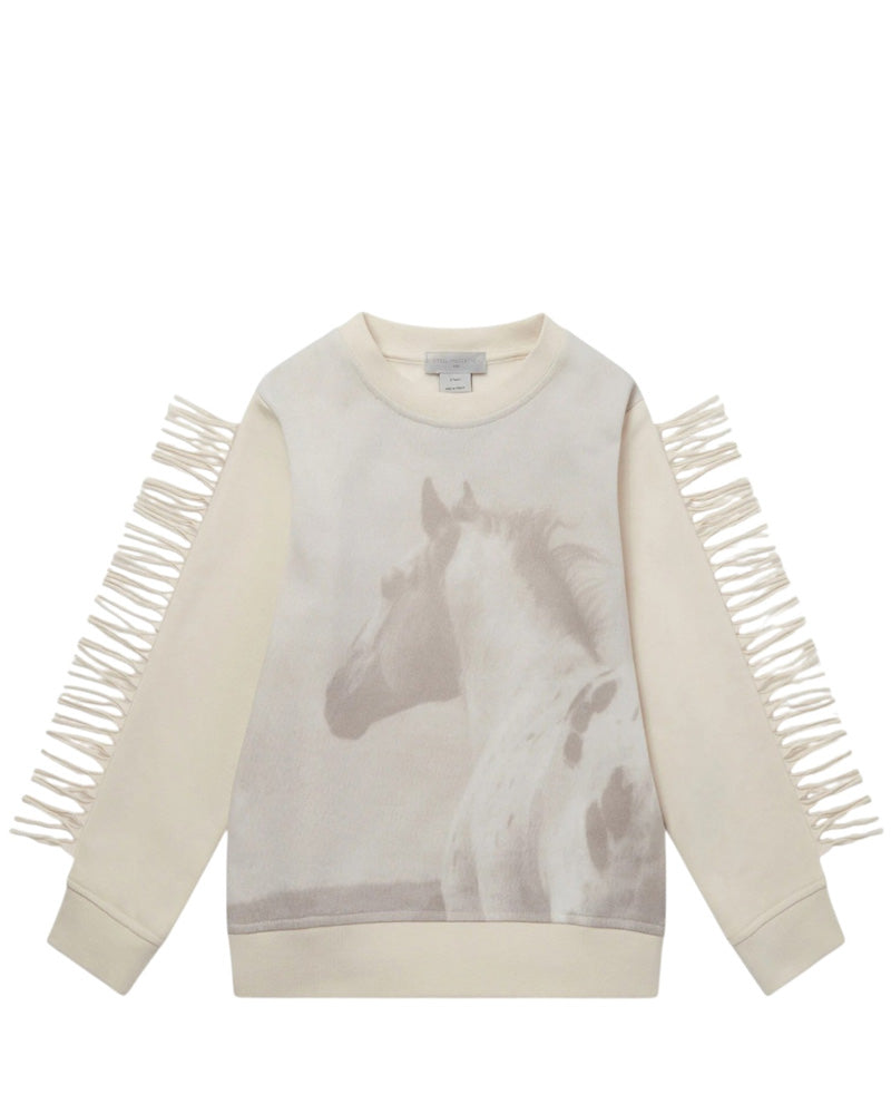 Felpa realizzata in cotone garzato da bambina. Presenta collo tondo, maniche lunghe con frange, stampa grafica di cavallo sul davanti, fodera in pile e finiture a coste.