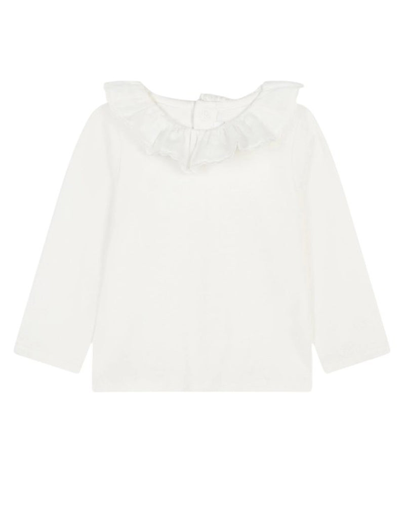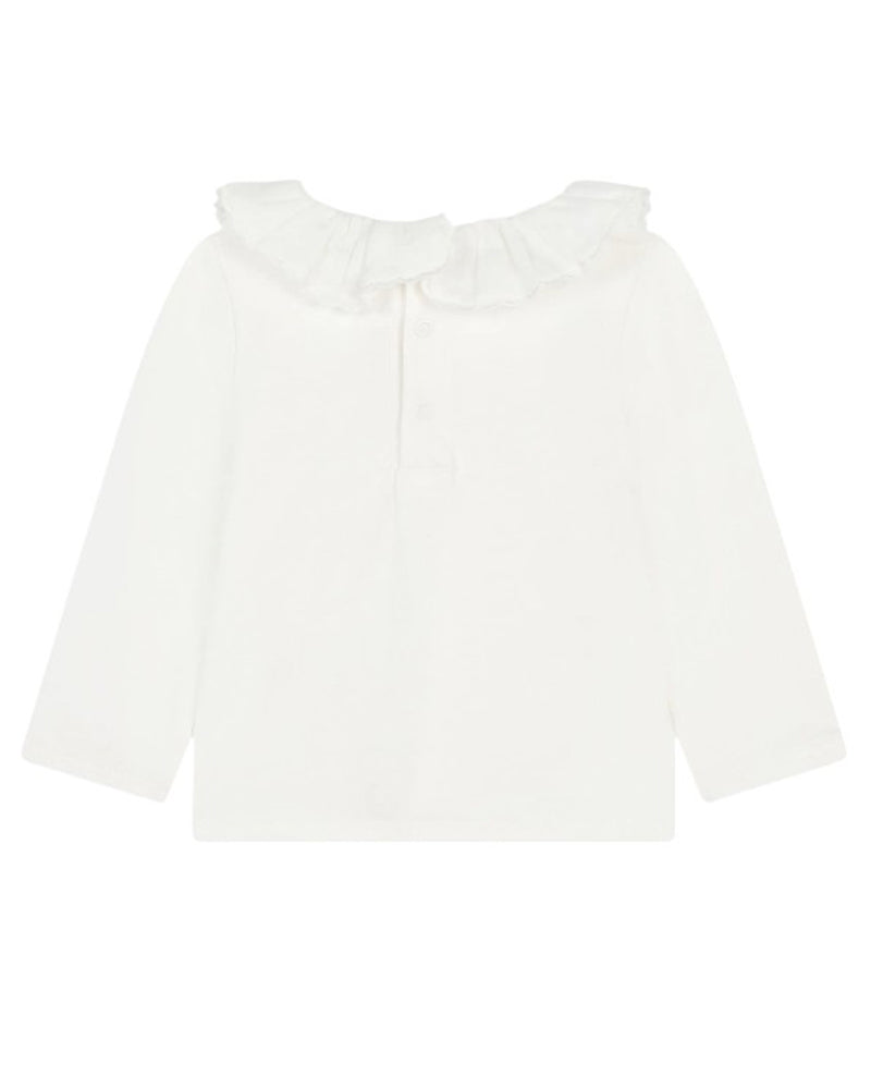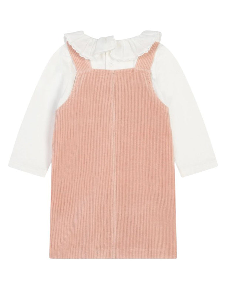 Completo due pezzi da neonata, composto da salopette realizzata in velluto a costine, con collo quadrato, taschine applicate sul davanti, logo ricamato e taglio leggermente svasato; T-shirt a maniche lunghe in jersey di cotone, con coletto a gorgiera e chiusura con bottoncini a pressione sul retro.