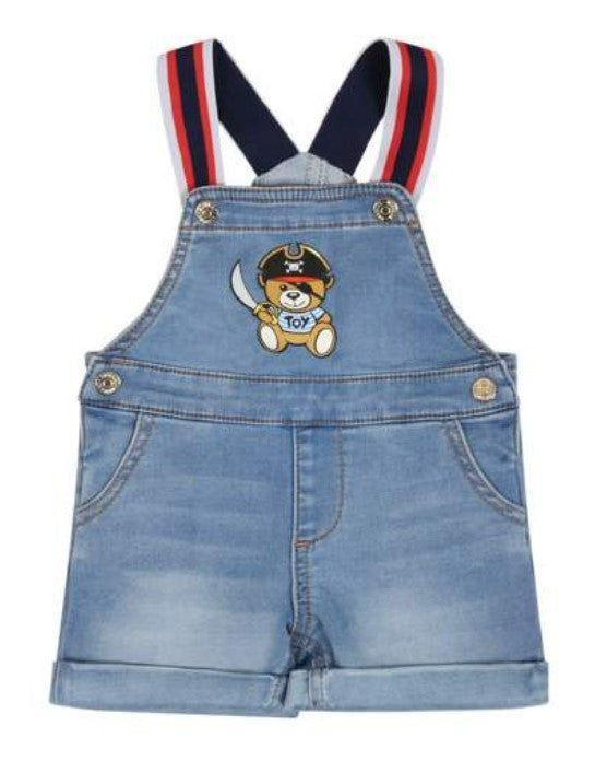 Salopette corta in denim di cotone con bretelle agganciate tramite bottone. Tasche sul davanti e bottoni laterali.
