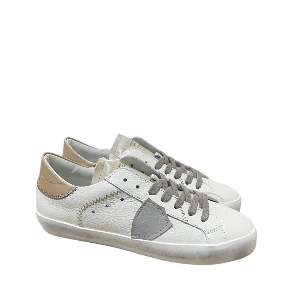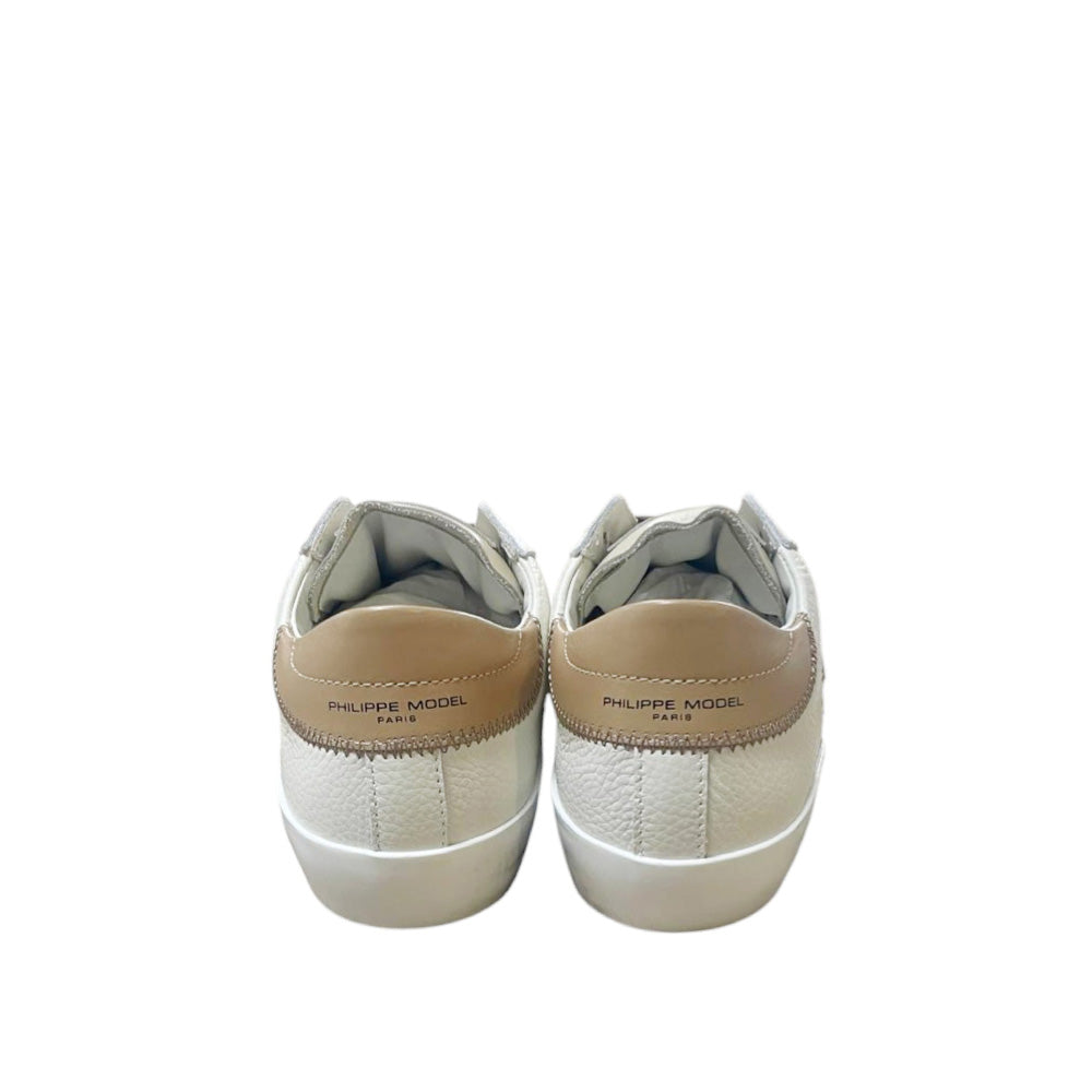 Presenta l'iconico scudetto Philippe Model sul lato, realizzato in pelle di colore grigio . Il talloncino posteriore (spoiler) è in contrasto, anch'esso di colore tabacco