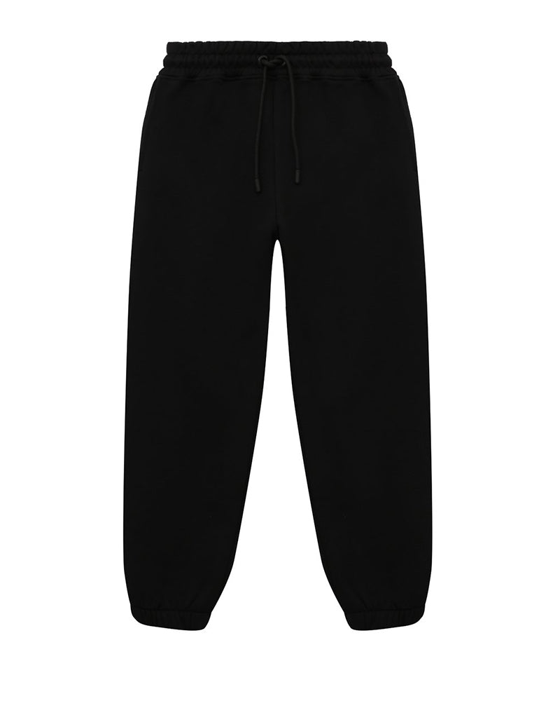 Pantaloni jogger neri da bambino realizzati in cotone garzato. Presentano vita elasticizzata con coulisse, due tasche laterali a filo, fodera in pile e fondo con elastico alla caviglia. Sono decorati con stampa sulla gamba e applicazione patch logo sul retro.