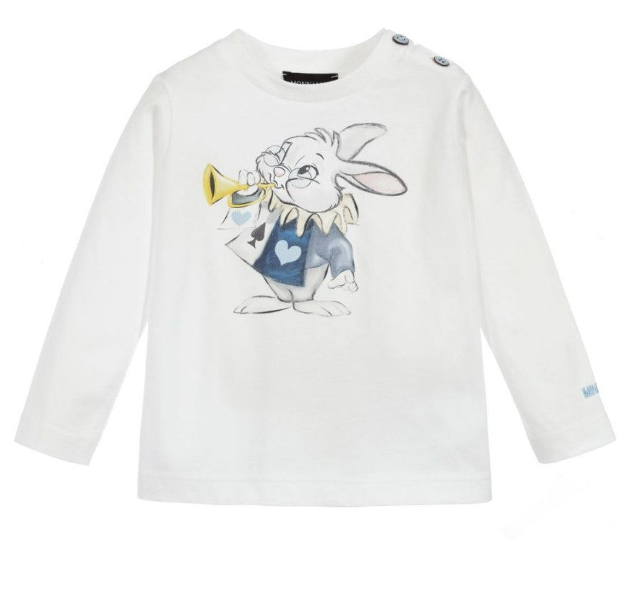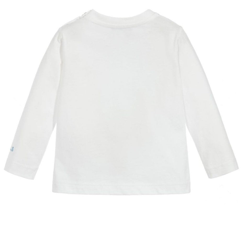 T-shirt girocollo a maniche lunghe con stampa sul davanti. Chiusura con bottoni sulla spalla.