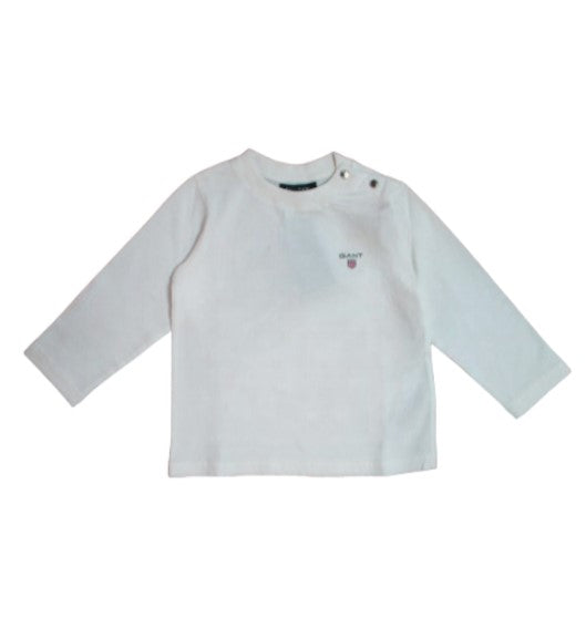 T-shirt girocollo a maniche lunghe con logo ricamato sul petto. Chiusura con bottoni a pressione sulla spalla.