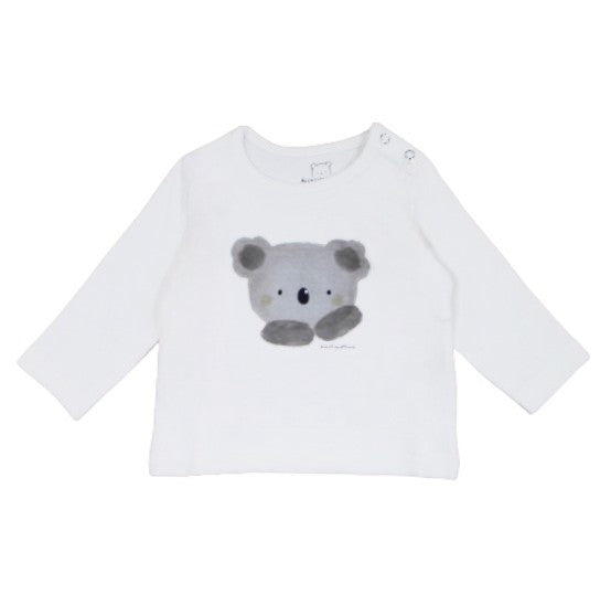 T-shirt girocollo, manica lunga, chiusura con clips sulla spalla, stampa sul davanti.