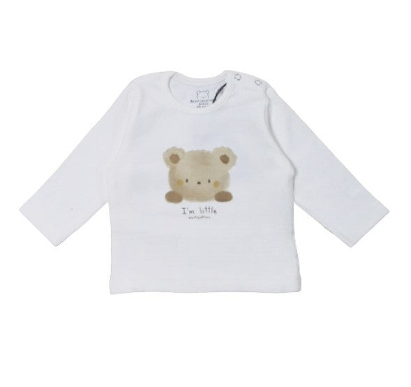 T-shirt girocollo, manica lunga, chiusura con clips sulla spalla, stampa in contrasto sul davanti.