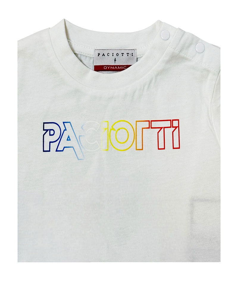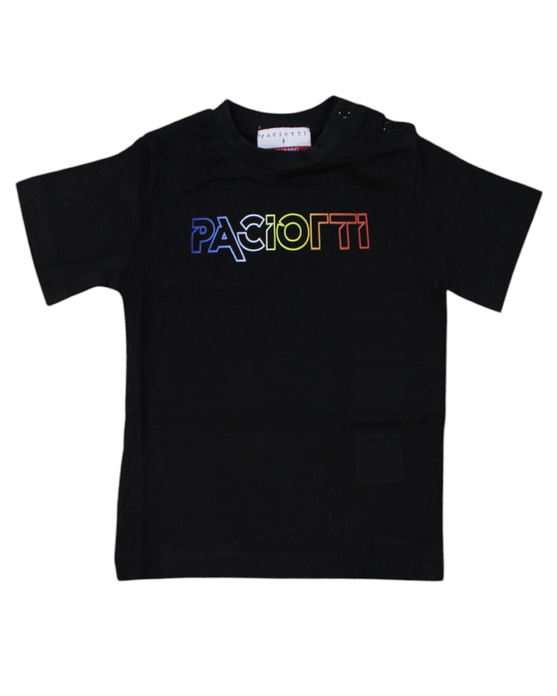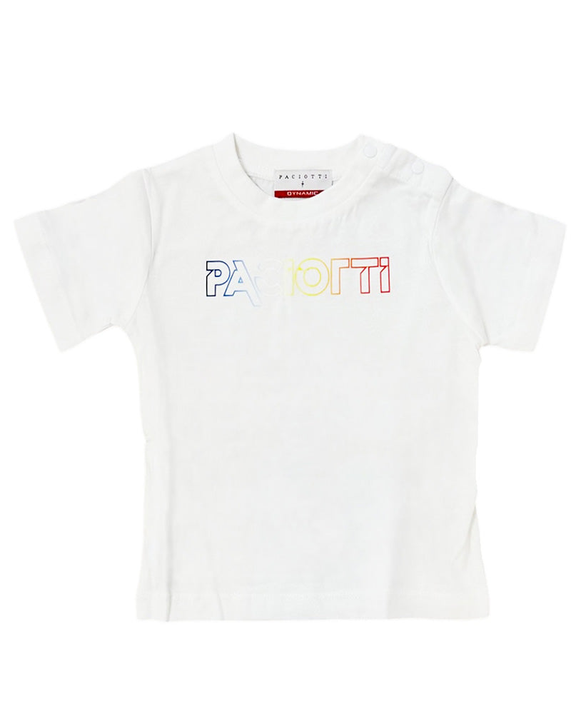T-shirt realizzata in cotone, girocollo, maniche corte, logo in contrasto stampato sul davanti, clips di chiusura sulle spalle.