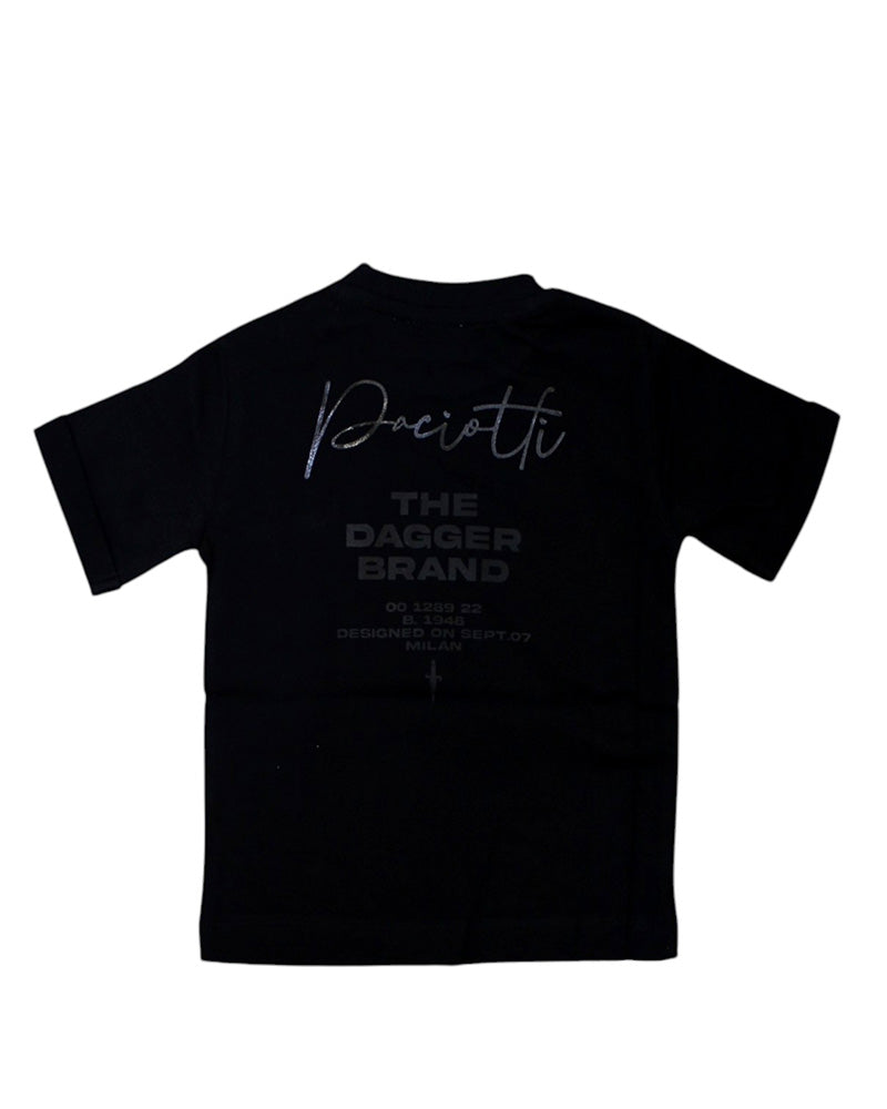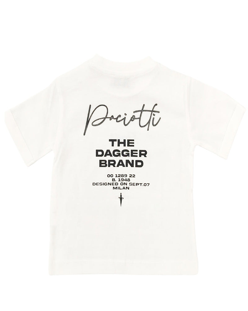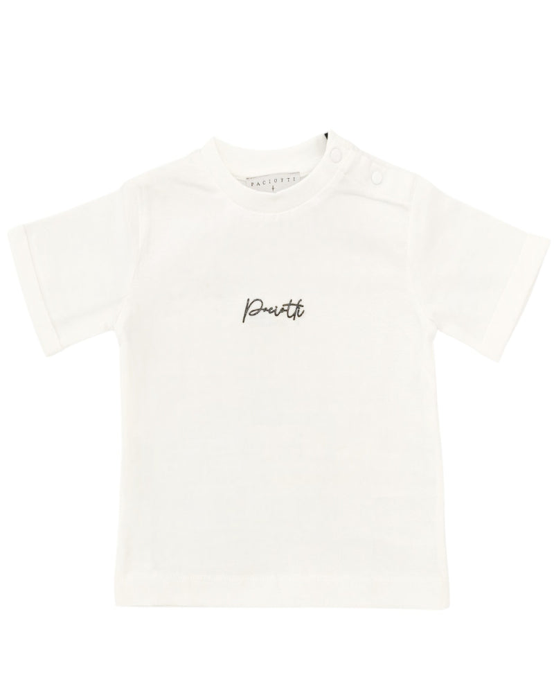 T-shirt realizzata in cotone, girocollo, maniche corte, logo applicato sul davanti in effetto gommato, clips di chiusura sulle spalle.