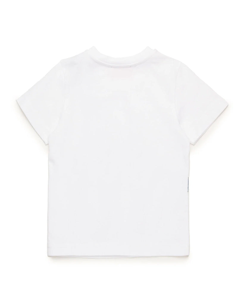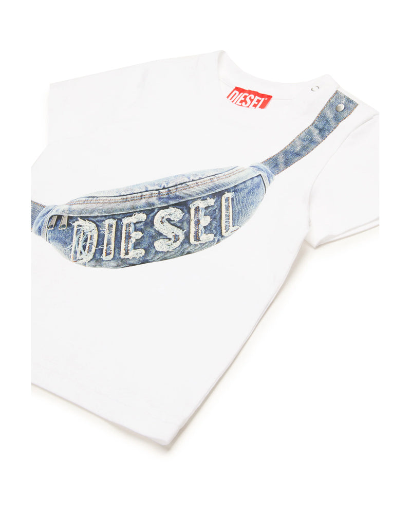 T-shirt girocollo a maniche corte in jersey. Presenta una stampa Diesel Hip Pack trompe l'oeil sul davanti. Pratica chiusura con bottoncini automatici sulla spalla.