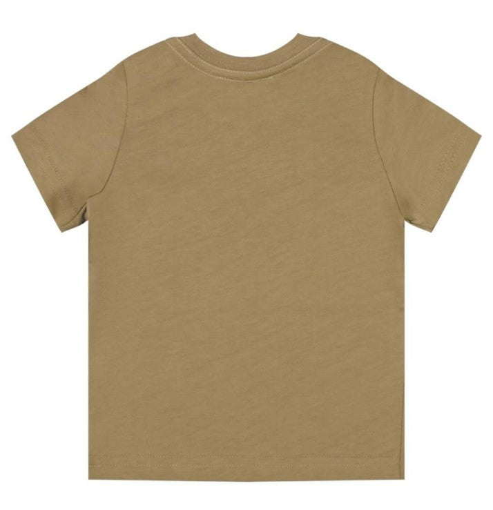 T-shirt girocollo manica corta con logo stampato sul davanti. Clips di chiusura sulla spalla.