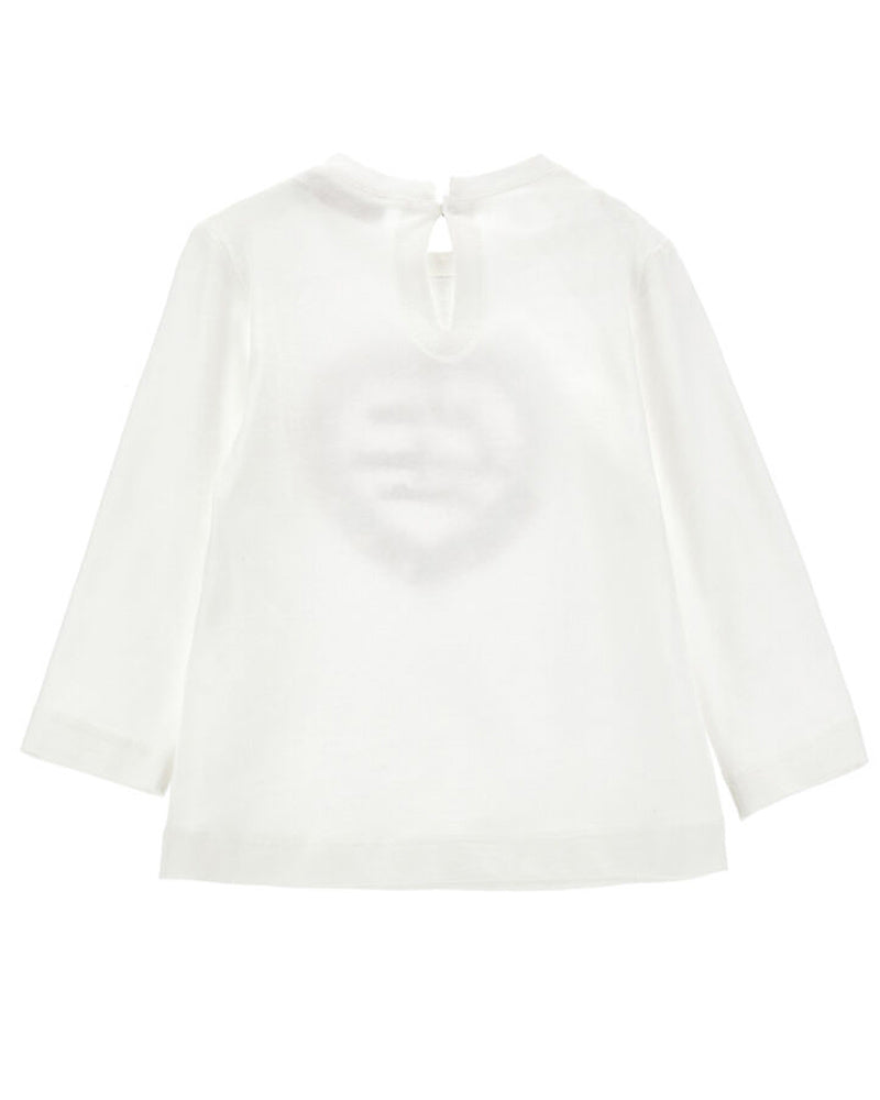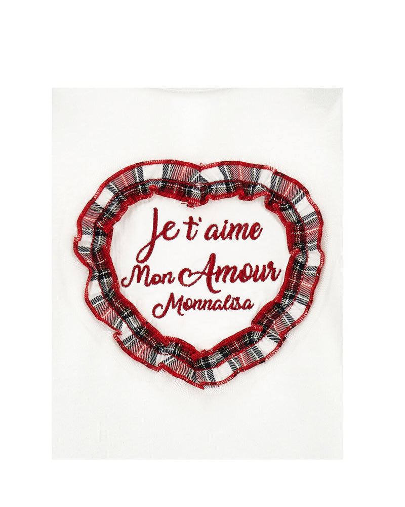 T-shirt a maniche lunghe realizzata in jersey di cotone. Presenta colletto tondo, ricamo Mon Amour e logo in cuore realizzato con rouches tartan sul davanti, chiusura con bottoncino sul retro.
