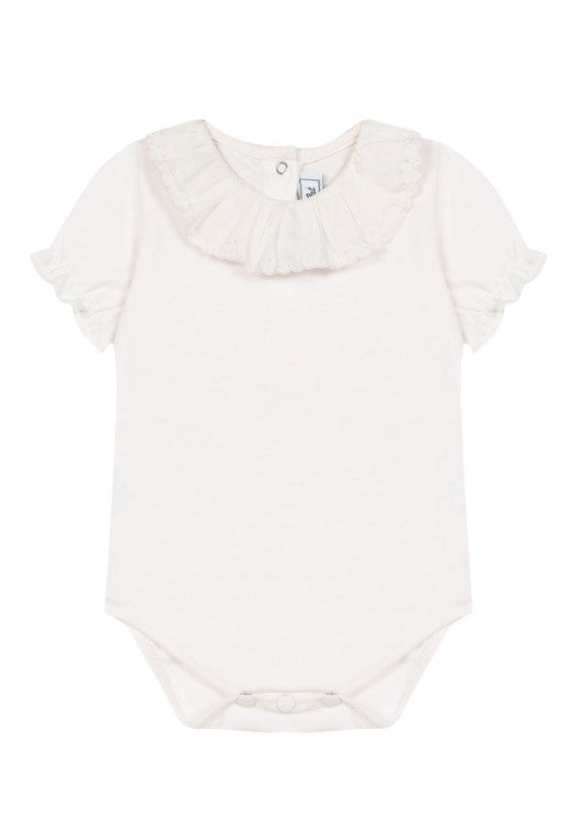 T-shirt a body manica corta, coletto tondo ricamato, clips di chiusura al cavallo e sul retro.
