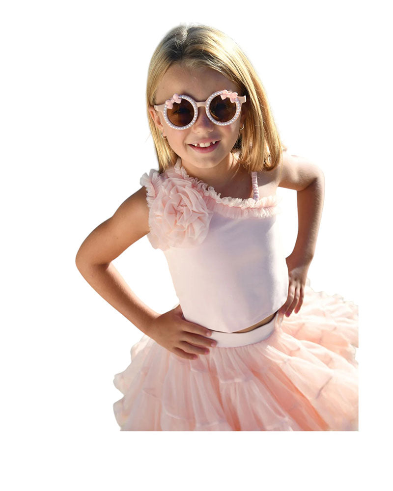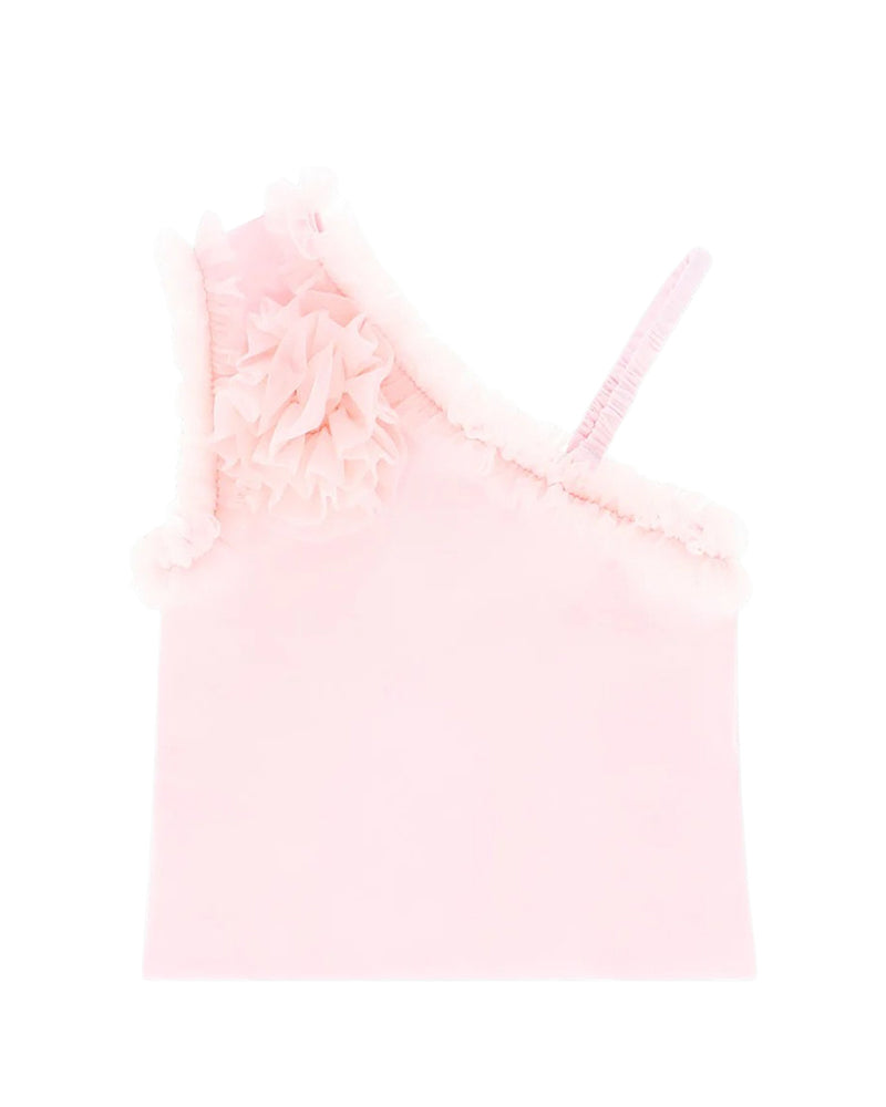 Top in misto cotone monospalla, ruches applicata in tono sulle maniche e sulla spalla, fiore in tessuto applicato.
