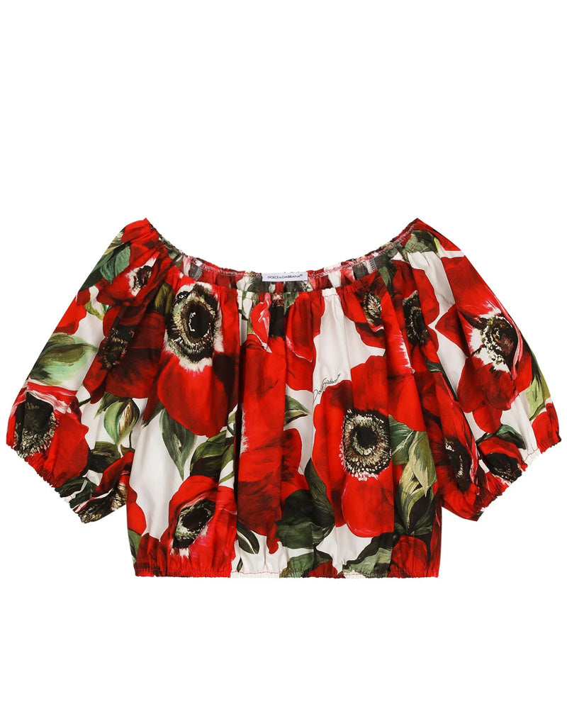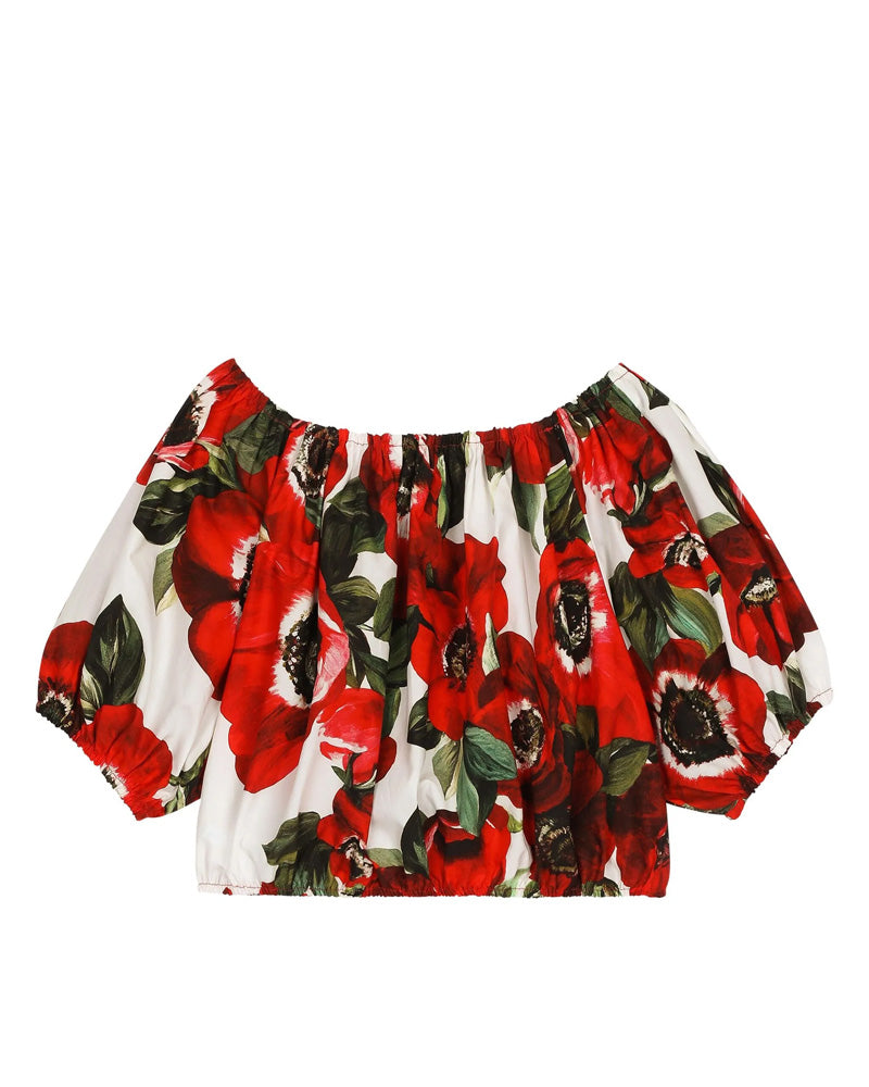 Blusa corta con stampa floreale all-over, caratterizzata da spalle scoperte e maniche corte con polsini elasticizzati. L'orlo elasticizzato.