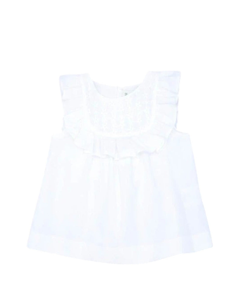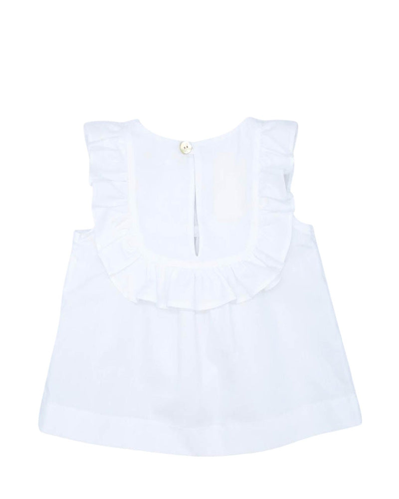 Top in cotone girocollo, giromanica, abbottonatura sul retro, ricamo sul petto, ruches decorativa.