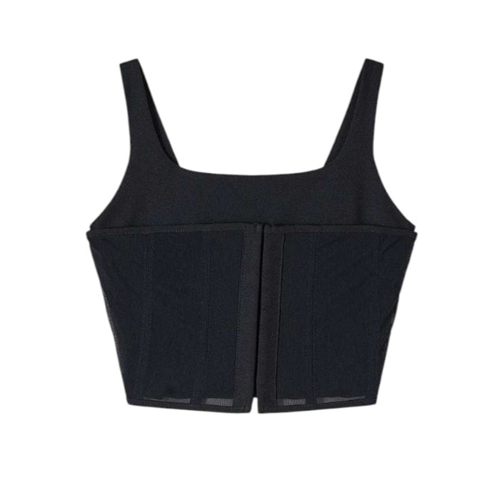 Corsetto da bambina realizzato in tessuto elasticizzato, caratterizzato da scollo quadrato, spalline, chiusura laterale con zip. È decorato con placca logo in metallo sul retro.