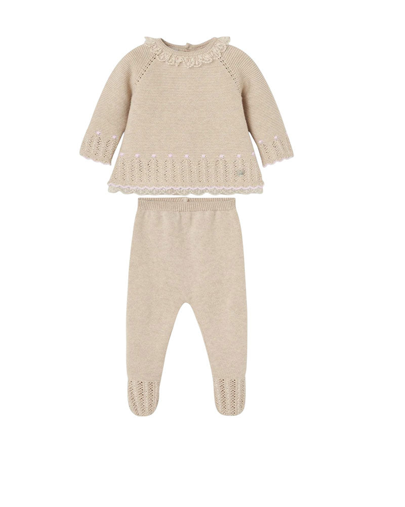 Maglia calda e piacevole al tatto in delicata miscela di cotone e cashmere. Presenta punto fantasia sullo sprone e dettagli in pizzo su collo e fondo. Fiocco decorativo sul davanti.