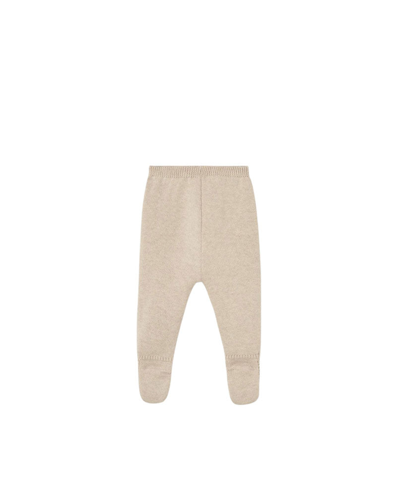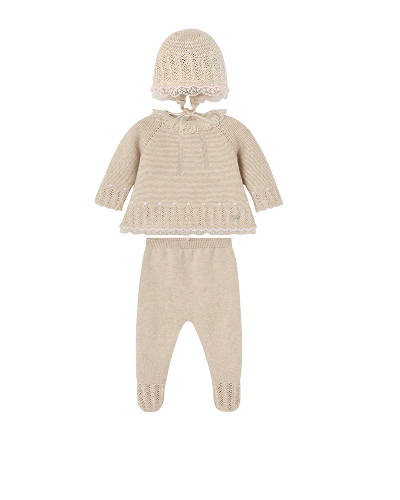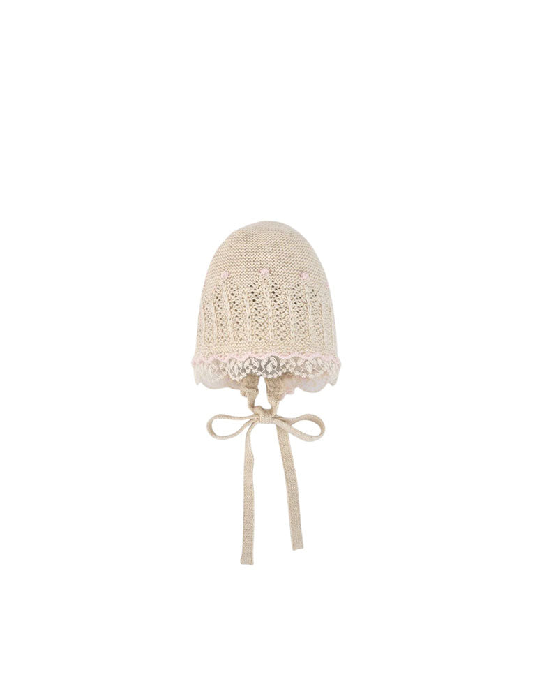 e cuffietta realizzata in pregiata miscela di cotone e cashmere, con motivo fantasia lavorato a maglia, nastrini in gros grain e placca decorativa in madreperla