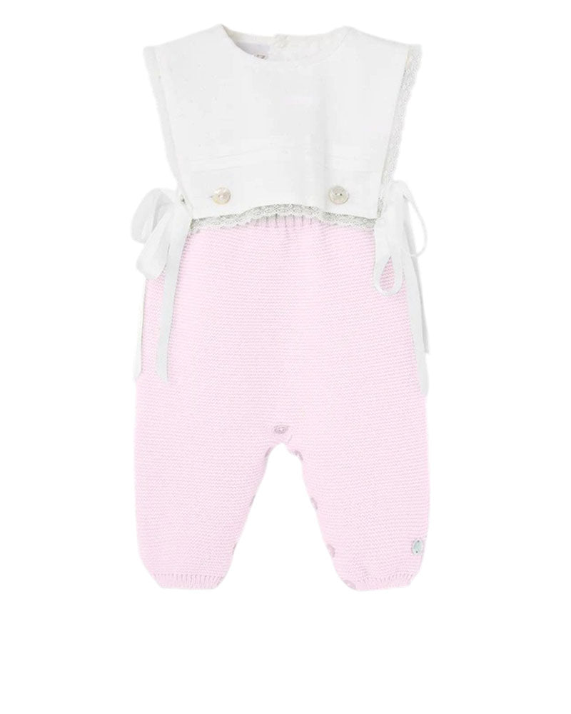 Tutina 2 pezzi per neonato/a firmata Paz Rodríguez, in maglia rosa con corpetto bianco decorato con pizzi, pieghe e bottoncini completa di Body a maniche lunghe in jersey con classico colletto baby e bottoni sul davanti. Dotata di bottoni sul cavallo per facilitare il cambio. Elegante e delicata, ideale per occasioni speciali.