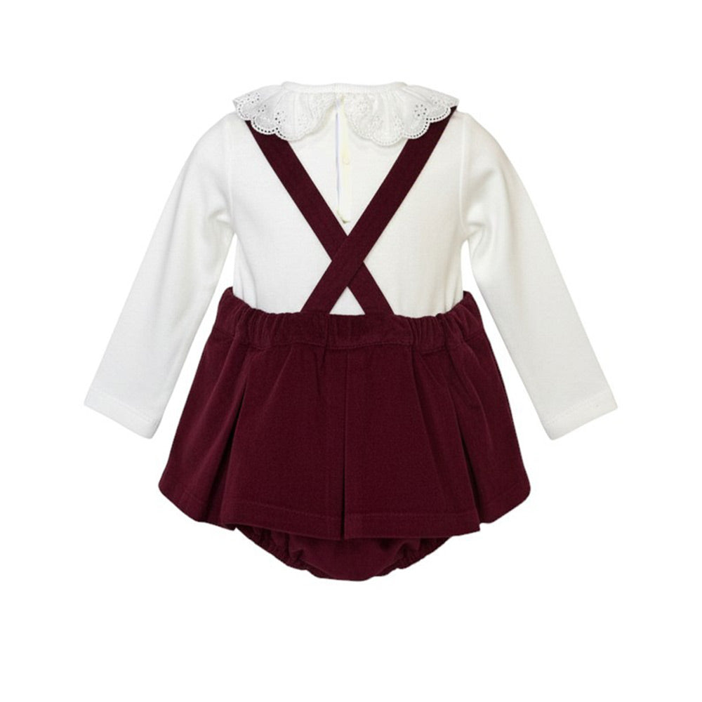 Vestina a salopette in velluto con culotte inserita, bretelle e vita elasticizzata. Body realizzato in jersey di cotone, con colletto in pizzo di sangallo, maniche lunghe e chiusura con bottoncini sulla parte posteriore.