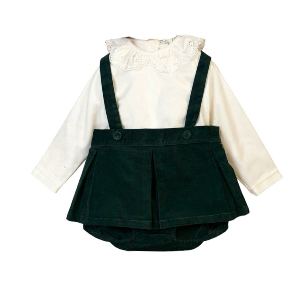 Vestina a salopette in velluto con culotte inserita, bretelle e vita elasticizzata. Body realizzato in jersey di cotone, con colletto in pizzo di sangallo, maniche lunghe e chiusura con bottoncini sulla parte posteriore.