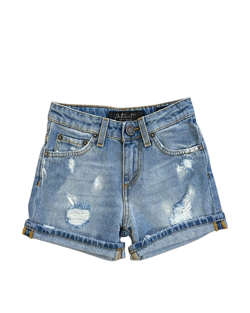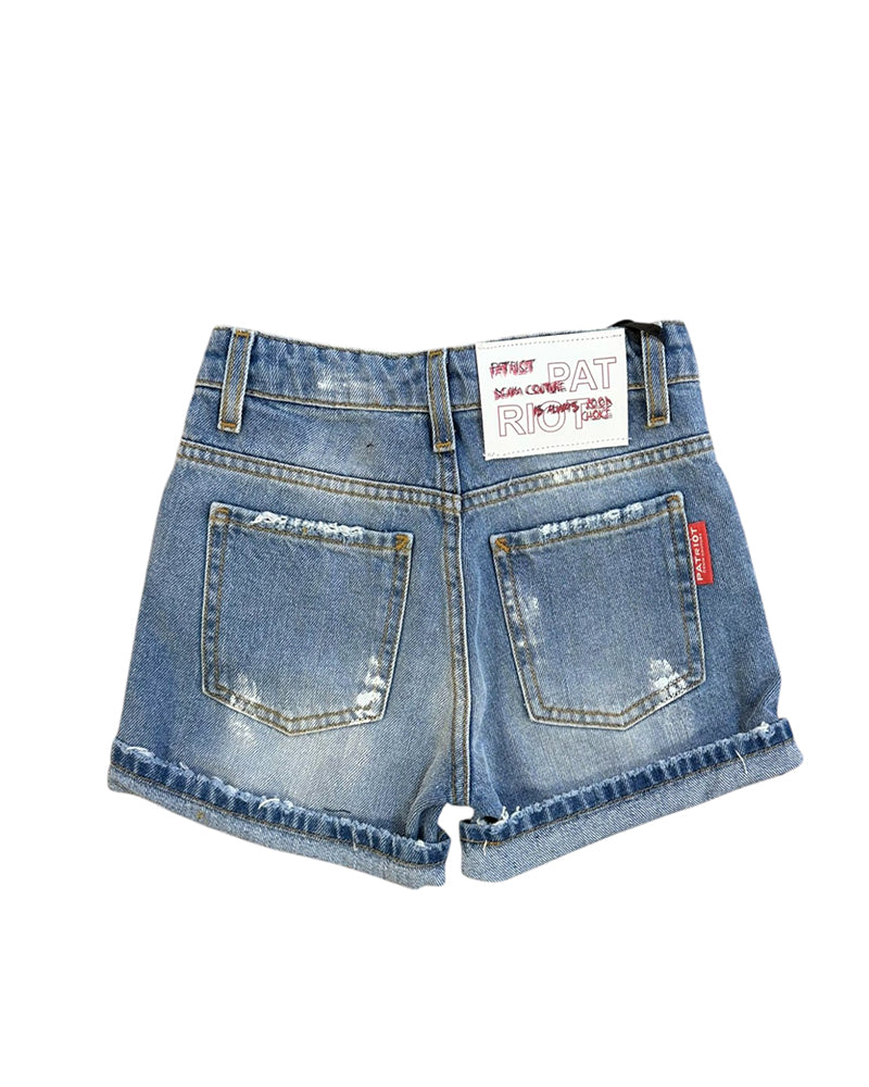 Bermuda realizzati in denim di cotone stretch, modello cinque tasche. Presentano chiusura frontale con bottone e zip, passanti per cintura, lavaggio used con dettagli destroyed, risvolto al fondo e patch logo sulla parte posteriore.