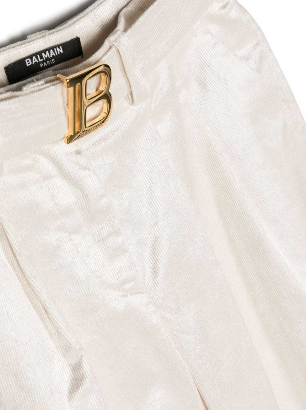 Palazzo-Hose aus Stoff mit Mille-Streifen, Haken- und Reißverschluss vorne und Gürtel mit Logo an der Taille.