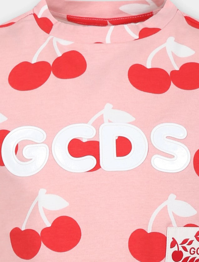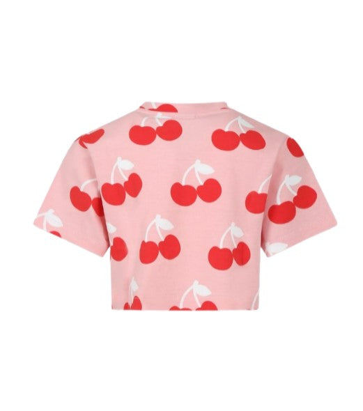 Kurzes T-Shirt mit kurzen Ärmeln, Rundhalsausschnitt, durchgehend gemustertem Stoff und Logo-Applikation auf der Vorderseite.