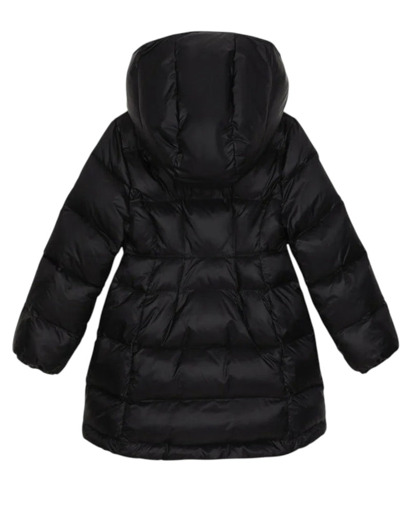 Lange Steppjacke mit abnehmbarer Kapuze, Reißverschluss vorne, seitlichen Leistentaschen und Logo-Patch-Applikation auf der Brust.
