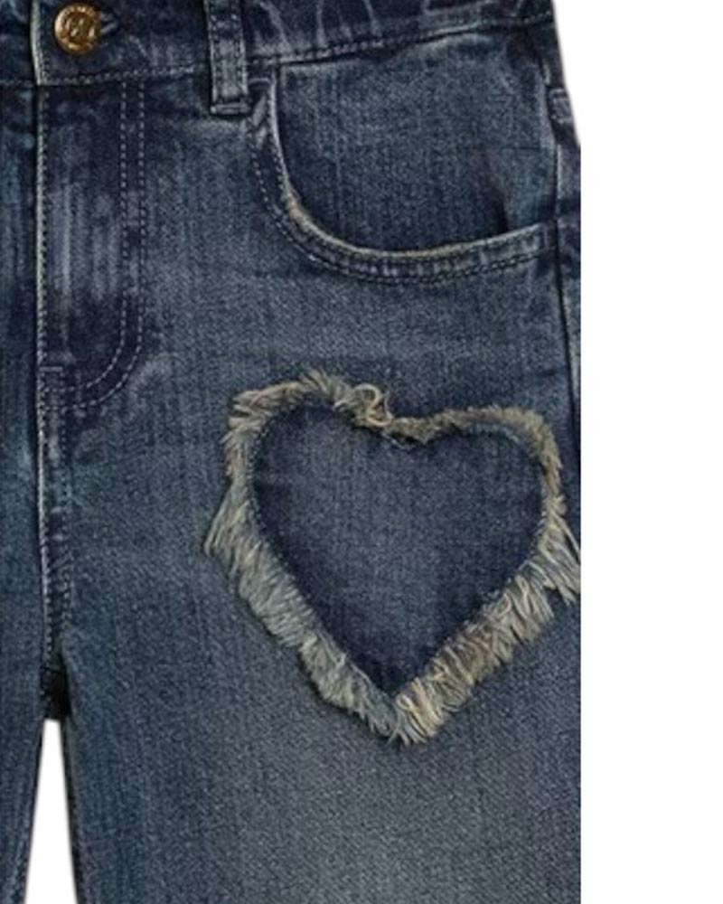 Jeans a palazzo da bambina realizzati in denim di cotone. Presentano chiusura frontale con bottone e zip, vita elasticizzata, due tasche sul davanti e un tascino sul retro. Sono decorati con applicazioni patch a cuori con dettagli sfrangiati sul davanti e sul retro.