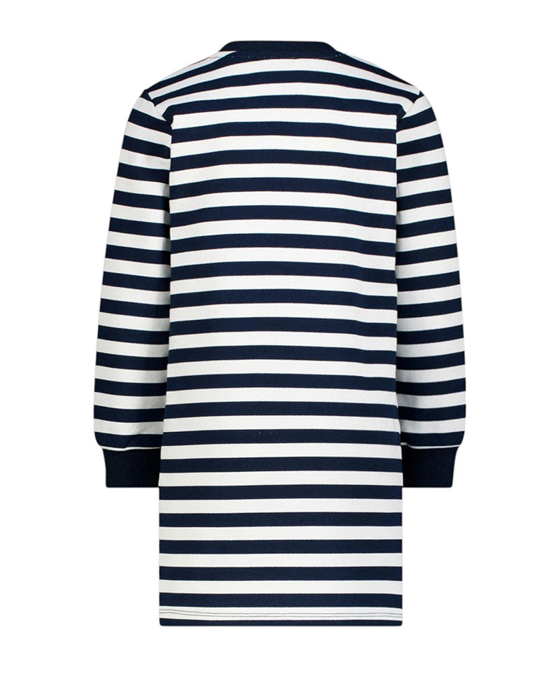 Abito da bambina realizzato in felpa di cotone sgarzato. Presenta fantasia a righe all-over, collo tondo, maniche lunghe, collo e polsi a coste, orlo dritto. È decorato con logo ricamato con dettagli in punto spugna sulla parte anteriore.